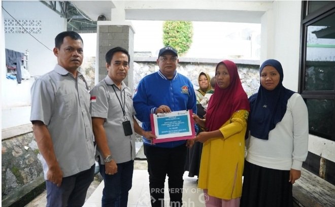 Bantuan dari PT TIMAH Tbk ini diserahkan langsung oleh Departement Head TJSL PT TIMAH Tbk, Risal Barung Mangontan kepada Winda (37) Ibu Baharudin yang turut disaksikan Ketua DPC HNSI Kabupaten Bangka, Slamet Riyadi, Rabu (10/12/2025),
